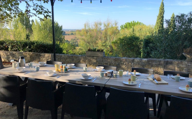 Behind the house, you can find a large terrace where you can stay in the shade of two huge chestnut trees. If you prefer a drink under the pergola, enjoying the panoramic view and the colorful garden, wooden dining tables and garden chairs are ready at your disposal.